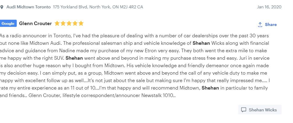 Commitment to service and helping clients find the best deal on an Audi vehicle. Several years of racetrack experience in order to demonstrate what your Audi can really do. I aim to be one of the best advisors for the Toronto and GTA Audi dealerships.